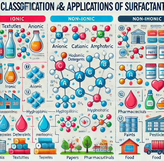 Surfactants are classified into ionic (anionic, cationic, amphoteric) and non-ionic types and are composed of hydrophilic and hydrophobic parts that alter the properties of surfaces and interfaces. Major application fields include textiles, household detergents, paper manufacturing, pesticides, pharmaceuticals, paints, cosmetics, and food, with textiles and household detergents accounting for the highest demand. Anionic surfactants hold a significant share (65–70%), while the use of non-ionic and other types is also increasing.