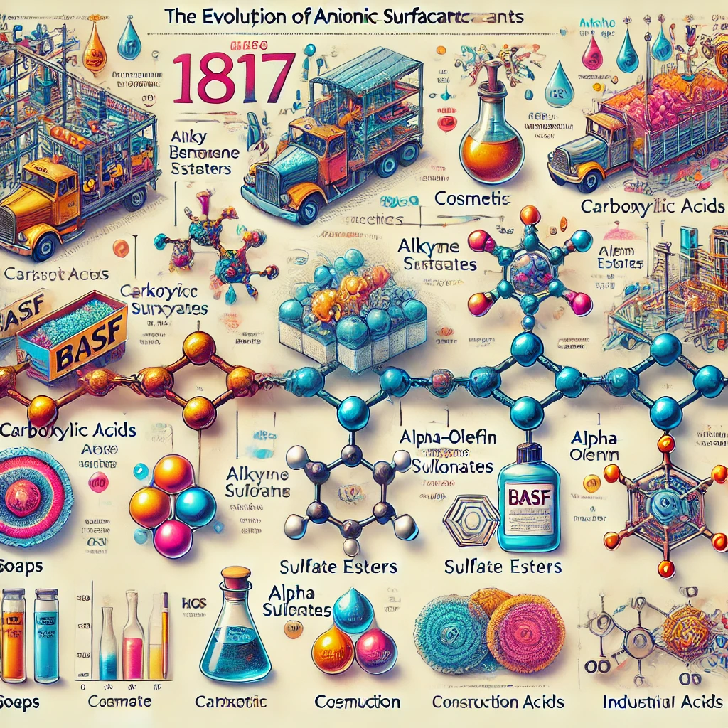 Anionic surfactants have evolved since their industrialization in 1817 by BASF. Initially used in textiles, their applications now span industries such as cosmetics, construction, and food. Their affordability, ease of manufacture, and excellent properties have made them staples in detergents and industrial cleaners. The primary functional groups are carboxylic acids, sulfate esters, and sulfonic acids, each with unique properties. Carboxylates like soaps have ancient roots, while modern derivatives like alkylbenzene sulfonates (LAS) have high environmental compatibility and are widely used in detergents. Other types, such as ether carboxylic acids and alpha-olefin sulfonates (AOS), are valued for their stability and versatility across various industrial applications.