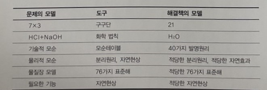 수직축은 추상화의 정도를 나타낸다. 즉 아랫부분은 실제의 영역이고 윗 부분은 추상의 영역이다. 수평축은 시간의 흐름(문제풀이과정)으로 보면 된 다. 현실의 문제 "사과가 전부 몇 개인가?"는 아랫 부분에 위치하고 "7 x 3" 은 수직으로 상승한다. 현실의 영역에서 추상의 영역으로 옮겨진 것이다. 이 것이 문제의 모델링이다. 추상의 영역으로 옮겨진 문제는 구구단이라는 방 법론을 이용하여 "21"이란 추상 영역의 해결책 (모델링된 해결책)으로 전환 된다. 추상 영역의 해결책은 현실 영역의 해결책으로 전환 되어 "21개의 사 과가 된다. 한편 표 7.3에서 현실의 문제에서 현실의 해결책을 곧 바로 찾아가는 과정은 무엇을 의미하는가? 문제를 모델링 하지 않고 해결을 시도하는 것을 말한다. "사과가 몇 개인가?"의 문제에서 직접 상자 하나 하나를 열어가면 전체의 사과를 세는 행위와 비슷하다. 모델링을 하지 않고 문제를 해결하는 것을 일종의 "시행착오 방법" (Trial and Error)이라고 할 수 있다. 트리즈에 서는 이러한 시행착오적인 방법이 문제해결시에 훨씬 더 많은 시간을 요구 한다거나, 실패할 확률이 높다고 이야기 한다. 주된 이유로 기술자가 가지고 있는 심리적 관성과 문제해결에 대한 일반적인 지식을 적용하지 못했음을 지적한다. 트리즈란 이러한 사고과정에 대한 이론(추상화 이론, Abstract Theory)을 바탕으로 기술자의 심리적 관성을 제거하고 문제해결에 대한 일 반적 지식을 적용할 수 있게 한다. 모델링된 문제의 해결책을 제시하기 위한 방법론들을 제공하고 있는 것이다. 좀 더 구체적으로 이야기 하면 문제를 모 델링하는 방법(기술적 모순, 물리적 모순, 물질장모델, 난장이모델)과 모델링 된 문제를 해결책으로 전환시켜주는 방법론(모순테이블, STC 연산자)등이 있고 모델링된 해결책 (40가지 발명원리, 76가지 표준해)까지 동시에 제시하 고 있는 것이다.