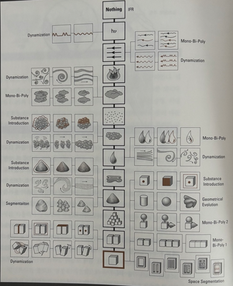 용융해서 흘리고는 마지막에 절단만 하면 되는 공정이다. 40가지 발명원리의 17번 원리가 적용되면서 지구중력장을 이용하여 롤 러가 작아지다 못해 원자수준까지 간 것 마저 없애 버린 것이다. 그림 6.28은 미세수준으로의 전이에 대한 다양한 진화 법칙을 상징적으로 설명하고 있다.