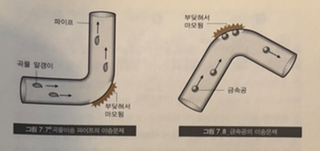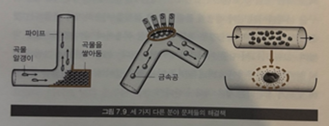 이 예제는 미국의 트리즈컨설팅회사이자 트리즈 S/W 회사인 인벤션머신 Invention Machine의 초창기 시절 자문 결과이다. 제철공장에서는 용광 로에 철광석을 공급하기 위하여 그림 7.6과 같이 호퍼(금속으로 만든 대형 깔때기)를 사용한다. 철광석은 밀도가 높고 단단한 물질이어서 용광로로 쓸려 내려가는 과정 에서 호퍼의 면에 강한 마찰을 일으킨다. 이러한 마찰이 지속되면서 호퍼는 오래 견디지 못하여 그림과 같이 구멍이 발생하고 제철회사는 막대한 경비 를 들여 호퍼를 수리하거나 교체한다. 이러한 문제를 해결하기 위해 트리즈 전문가들은 해당 문제를 일반화 하였다. 모순이나 여러 다른 툴들을 이용해서 일반화할 수도 있지만, 다른 산업분야에서 비슷한 사례를 찾아 그 해결책을 찾는 것도 일반화의 좋은 방 법이다. 방앗간이나 식물가공 업체에서 쌀알 등의 곡물이 그림 7.7과 같이 파이 프를 통하여 이동되는데 구부러진 공간에서 곡물 알갱이들이 파이프와 부 딪혀서 파이프가 견디지 못한다. 또한 금속으로 된 작은 알갱이들을 운반하는 파이프의 경우에도 그림 7.8과 같이 동일한 문제가 발생한다.
