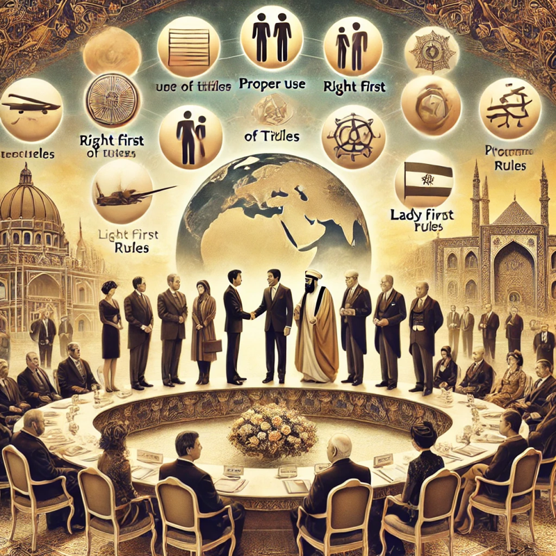 Prior approval is required to introduce women to high-ranking officials, with married women prioritized for presidents and clergy. Titles must be used, and "Esquire" and "The Honourable" have different usages in the UK and US. Western etiquette follows "Right First" and "Lady First," prioritizing women, elders, and foreigners. Protocol differences between the UK and Persia led to conflicts over seating, footwear, headwear, and attire.