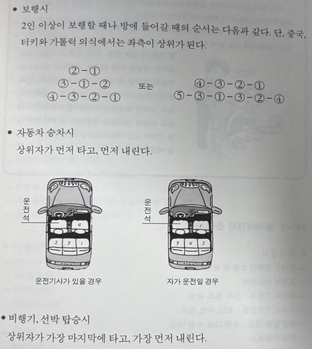 지위가 비슷한 경우에는 여자를 남자보다. 연장자를 연소자보다. 외국인을 내국인보 다 상위에 둔다./ 여성들간의 서열은 기혼자, 미망인, 이혼녀, 미혼자순이며 기혼자간의 서열은 남편의 지위에 따른다./ 공식적인 서열을 갖지 않은 사람이 공식행사나 연회 등에 참석할 경우에는 당사자의 개인적·사회적 지위, 연령 등을 고려하여 정한다./ 원만하고 조화로운 좌석배치를 위해서는 서열 결정상의 원칙이 다소 조정될 수 있다.