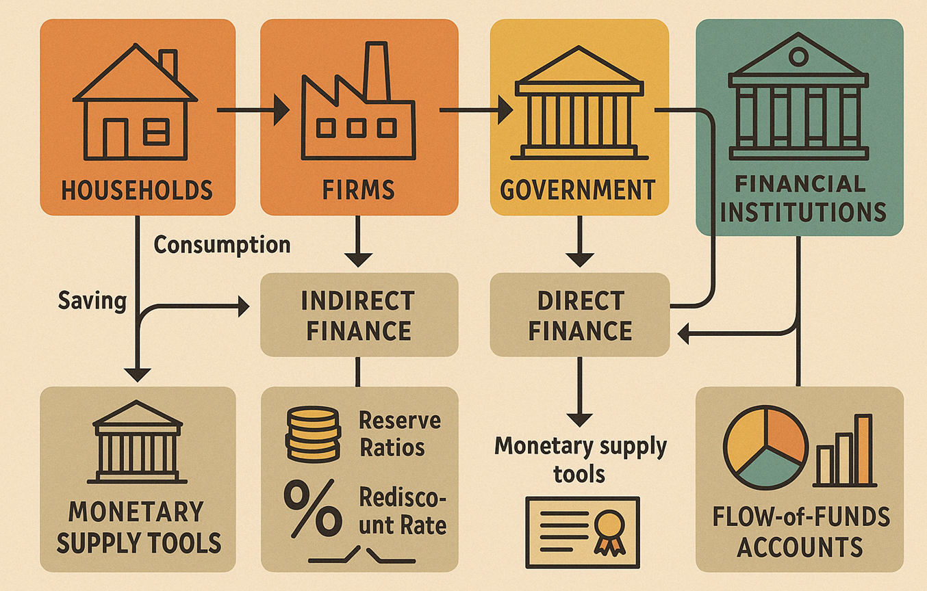 The flow of money is driven by income, consumption, investment, and saving among four sectors—households, businesses, financial institutions, and the government—where households generally have a surplus from saving and businesses a deficit from investment, prompting inter-sectoral fund movements through financial intermediation, including short-term (bank loans, CPs) and long-term (bonds, equity) financing; fund transfers occur via indirect financing (through banks) and direct financing (via capital markets), while money supply is regulated either by direct controls (credit ceilings) or indirect tools (rediscount rate, reserve requirement, open market operations); the flow-of-funds accounts are comprehensive economic statistics that visualize the financial relationships and imbalances across sectors, highlighting how each secures and uses funds; domestic finance refers to transactions in local currency (KRW) between residents, whereas international finance encompasses foreign currency transactions and cross-border capital flows, including Eurocurrency markets, requiring high expertise due to differences in currency, law, and customs across countries.