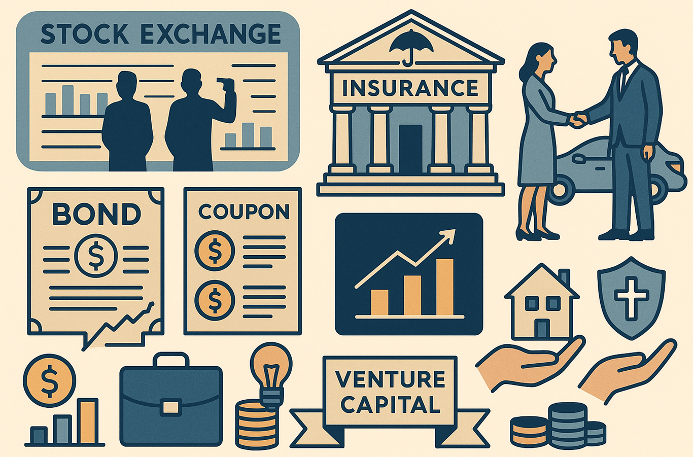 The financial system is shifting from indirect banking markets, where institutions deal one-on-one with clients, to direct securities markets, where standardized assets like stocks and bonds are traded competitively. Stock exchanges enhance liquidity by centralizing orders, using auctions or market makers to form reliable prices and support bond pricing and secondary markets. Insurance enables risk-sharing for unforeseen events through public and private schemes, offering life or non-life coverage and managing long-term funds for both social and industrial needs. Leasing provides asset access through financial leases, akin to loans with maintenance by lessees, or operating leases, service-focused with lessors covering upkeep, favored in Korea for tax benefits. Venture capital supports high-tech but cash-poor startups via equity or loans, typically exiting through IPOs, backed by legal frameworks since the 1980s and often structured as investment partnerships abroad. Each element—markets, exchanges, insurance, leasing, and venture capital—plays a vital role in mobilizing and allocating capital efficiently across the economy. The move toward market-based finance reflects the demand for liquidity, innovation, and diversified funding sources beyond traditional banking. Exchanges standardize and secure trading environments, enhancing investor trust and contributing to price transparency and capital flow. Insurance and leasing offer financial stability and operational flexibility to individuals and firms, facilitating risk management and resource optimization. Venture capital fosters innovation and entrepreneurship, bridging the gap between technological potential and financial backing, driving long-term economic growth.