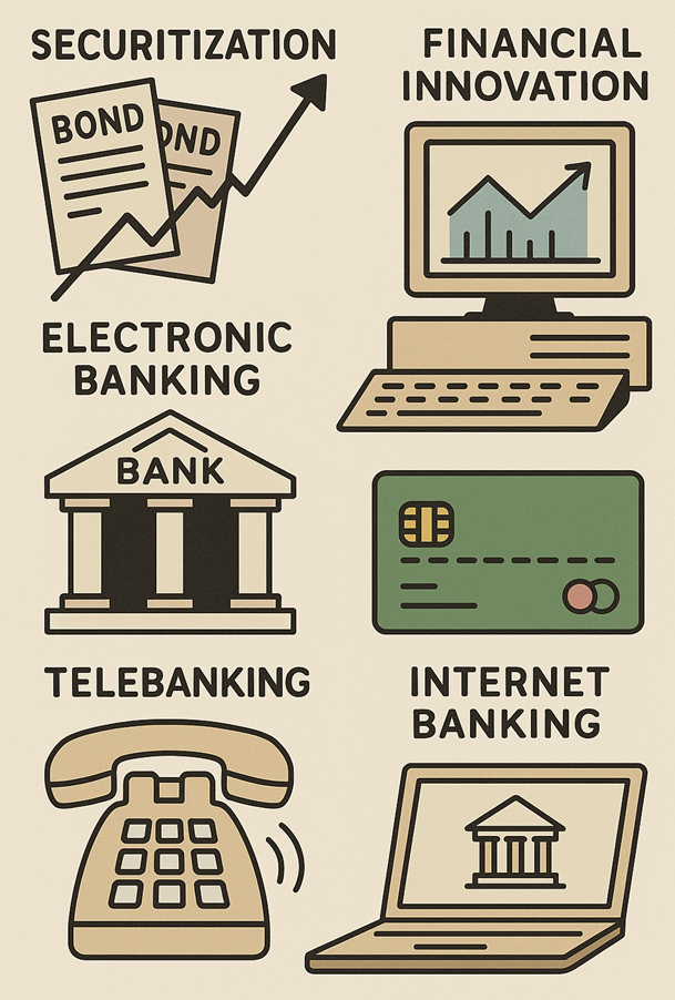 Securitization in finance refers to the transformation of funding methods from ban k loans to securities issuance, starting in the late 1970s in the United States. Financi al innovation involves the emergence of new financial products and market transfo rmations driven by advancements in computer and communication technologies, addressing risks associated with exchange rate and interest rate fluctuations. Electr onic banking utilizes computer and information technology to efficiently handle ba nking operations and expand financial services, including home banking and firm b anking. Telebanking allows customers to perform banking tasks such as account tr ansfers and balance inquiries via phone, offering lower fees. Internet banking enab les customers to access banking services through the internet, providing convenien ce and fee reductions. The International Monetary Fund (IMF) aims to facilitate inte rnational monetary cooperation, promote international trade, stabilize exchange ra tes, establish a multilateral payment system, and support member countries in cor recting balance of payments imbalances, also acting as a financial institution. The World Bank supplies long-term funds to promote economic development in develo ping countries and complements the IMF. Major international financial markets incl ude London, New York, and Tokyo, which are centers of international financial tran sactions.