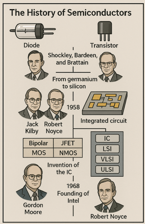 The history of semiconductors begins with the invention of the diode and transistor, notably in 1947 by Shockley, Bardeen, and Brattain, followed by a transition from germanium to silicon as the core material, and the development of transistor types from bipolar to JFET, MOS, PMOS, NMOS, and CMOS, with initially generic terms later specified as newer technologies emerged, leading to CMOS becoming central to high-integration semiconductor design, while the invention of the IC in 1958 by Jack Kilby and Robert Noyce integrated transistors, resistors, and capacitors on a single chip, and introduced the concept of scalable integration as IC, LSI, VLSI, and ULSI, defined loosely by component count and often by design rules, enabling massive improvements over bulky vacuum tubes in density and size, with Noyce’s practical IC patent gaining recognition beyond Kilby’s original idea, and his collaboration with Gordon Moore to found Intel in 1968 shaping modern semiconductor business, as Moore’s Law and Intel’s growth surpassed even larger companies like Texas Instruments, and Fairchild Semiconductor’s founding laid the foundation for Silicon Valley, where Noyce’s leadership attracted investors without formal plans, symbolizing the shift from academic physics to industrial innovation, and culminating in today’s ultra-scaled, CMOS-based semiconductor era.