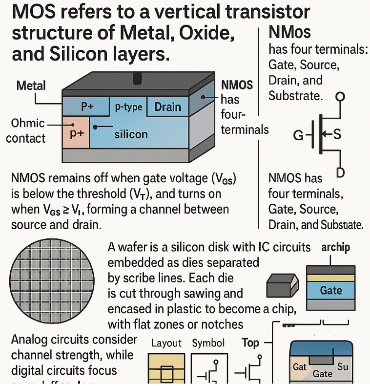 Voltage and current are defined relatively based on reference points, MOS refers to a vertical transistor structure of Metal, Oxide, and Silicon layers, and NMOS is a type of MOSFET using p-type and n-type silicon to control electron flow, with carriers generating current and the polarity denoted by dopant type rather than charge sign, p+ regions are added to enhance voltage delivery to p- areas through ohmic contacts, a wafer is a silicon disk with IC circuits embedded as dies separated by scribe lines, each die is cut through sawing and encased in plastic to become a chip, with flat zones or notches used as alignment markers during processing, NMOS remains off when gate voltage (VGS) is below the threshold (VT), and turns on when VGS ≥ VT, forming a channel between source and drain, source and drain are both n-type and functionally determined by voltage polarity, analog circuits consider channel strength, while digital circuits focus on on/off states, the oxide layer (SiO₂) beneath the gate is an insulator enabling channel creation, NMOS has four terminals: Gate, Source, Drain, and Substrate, and circuit design involves consistent mapping across layout, symbol, top, and cross-sectional views, engineers must correlate electrical behavior, layout, and schematic representations accurately, to ensure proper understanding and reliable fabrication of semiconductor devices.