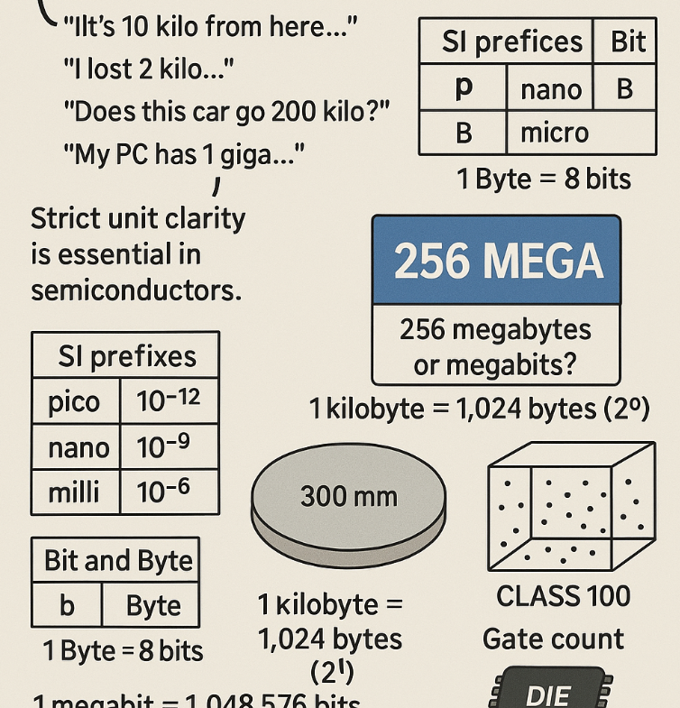In daily Korean conversation, units like kilo, mega, or giga are often used without full terms, relying on contextual understanding, which can confuse non-native speakers and create ambiguity, but in precision fields like semiconductors, strict unit clarity is essential, and SI prefixes like pico, nano, micro, and milli must be learned for their extreme magnitude range, with additional attention required for bit (b) and byte (B), which differ in both symbol and value, where a byte equals 8 bits, and storage units for systems (PCs, cameras) use bytes, while semiconductors use bits as the default unit, thus a "256 mega" label may mean 256 megabytes or 256 megabits depending on the context, highlighting the need for precise unit labeling to avoid confusion, especially when scientific terms like kilobyte represent 1024 (2¹⁰), not 1,000, as binary logic governs digital systems, making 1 megabit = 1,048,576 bits, semiconductor manufacturing also mixes units like inches, millimeters, mils, and micrometers, with 300mm wafers replacing older inch-based sizing, cleanroom standards are measured in “class” units, based on particle count per cubic meter, while gate count is used to estimate die complexity and area, though it is criticized for blending two metrics into one unclear term, and in all cases, precise unit understanding and labeling are vital in semiconductor industries.