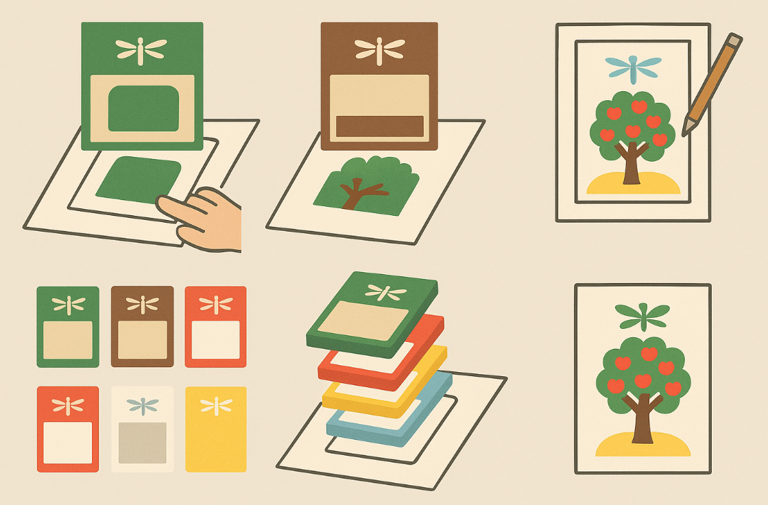 판화로 제작한다고 생각해 보자. 녹색, 갈색, 빨강, 하양, 노랑 그리고 하늘색 모두 여섯 가 지 색으로 되어 있다. 여섯 가지 색을 나타내기 위해서 도화지에 먹지를 대고 여섯 장을 외곽선만 똑같이 그린다. 테두리 선은 그 안에만 그린다는 것이고, 상단과 하단의 잠자리 표도 여섯 장 모두에 그려 넣는다. 도화지 여섯 장에 모두 밑그림을 그렸으면 그 중 한 장은 초록색 이 칠해질 부분만 칼로 오려 낸다. 이 때 잠자리 표도 칼로 오려 낸다. 다음엔 새로운 밑그림에 갈색이 칠해질 부분과 잠자리 표만 칼로 오려 낸다. 이런 식으로 빨강판, 노랑판, 하양판, 하늘색판을 각각의 색에 해당하는 부분과 잠자리 표를 칼로 오려 내어 구멍을 뚫는다. 이렇게 여섯 장의 밑그림에 모두 구멍을 뚫었으면, 녹색 판을 판화를 찍을 도화지 위에 대고 헝겊이 나 솜에 녹색 물감을 묻혀서 녹색판의 구멍 주위를 두드려서 색을 묻힌다. 이 때 잠자리 표 구멍도 솜으로 두드려 준다. 녹색관을 대고 작업을 끝낸 그림이다. 녹색이 칠해진 도화지가 잘 마르고 난 후 그 위에 갈색판을 대고 상단 잠자리 표와 하단 잠자리 표를 녹색이 칠해진 밑의 도화지에 잘 맞춘 후 이번에는 갈색 물감을 묻힌 솜으로 구멍 주위를 두드린다. 이 때도 역시 잠자리 표 주위도 두드려 밑의 도화지에 색깔이 배도록 한다. 녹색관과 갈색판 작업이 끝난 도화지 위에는 녹색과 갈색이 나타나 있다. 이처럼 빨강판, 노랑판, 하양판 그리고 하늘색판의 작업을 모두 끝내면 된다.