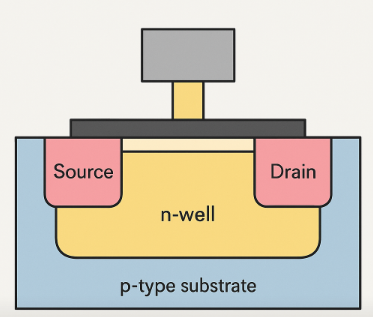 PMOS is structurally similar to NMOS but uses p-type source and drain formed on an n-well within a p-type substrate, where the n-well acts as an electrical bulk to control current paths, and PMOS turns on when gate voltage is lower than the source (VGS ≤ Vₜ, around -0.6V), forming a p-type channel that conducts holes from source to drain, operating in reverse logic to NMOS, and while early PMOS used n-type wafers, NMOS later became dominant due to higher speed, but modern CMOS integrates both to reduce power consumption, with PMOS fabricated on n-wells for electrical isolation and the p-substrate acting as mechanical support only, and like multi-color or etching printmaking in school art class, semiconductor processes mirror those printmaking techniques in layering and precision replication.
