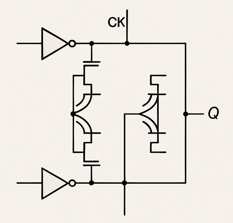 실제로 이런 딜레이 타임은 얼마나 될까? 사용하는 공정마다 구 동시키는 부하의 크기에 따라 달라지는데 게이트 하나 통과하는 데 걸리는 지연시간은 약 0.1나노초(100억 분의 1초) 정도 걸린다. 이벤트 C1은 CK가 0일 때 발생했다. CK=0이므로 트랜스미션 게이트 G4는 오프 되어 있다. 즉 D의 변화가 출력 Q, QN에 아무런 영향을 주지 못한다. 래치 내부에서는 그림 9.33에서와 같이 트랜스 미션 게이트 G6가 온 되어 있어서 신호가 G5 G7→G6→ G5→G7...과 같이 게이트들을 맴돌며 G4가 닫히기 직전의 신호를 유지하고 있을 뿐이다. 신호를 유지한다는 말은 기억하고 있다는 말 과 같으므로 래치는 메모리 기능이 있다. 래치란 빗장을 말하는데 아마도 빗장을 걸면 더 이상 들어올 수 없는 것과 비슷해서 그런 이름이 붙었을 것이다. 이벤트 D1은 이벤트 A1과 마찬가지고, 이벤트 E1은 이벤트 B1과 마찬가지다. 그림 9.30에서 붉은 부분은 언노운(unknown) 상태를 표시하는 것이다. 언노운이란 말 그대로 알 수 없는 상태라는 소리 다. 그림 9.30에서 CK는 A1에서 처음 1이 되어 그 때 처음 래치가 열려서 그 전에 래치가 무슨 값을 기억하고 있는지 알 수 없다는 뜻 이다. 지금까지 D 래치의 구체적인 내부 동작을 살펴보았는데 간단히 말하면, D 래치는 래치가 열렸을 때 입력을 받아, 래치가 닫혔을 때 그 값을 유지, 기억하고 있는 회로를 말한다. 물론 래치가 닫혔을 때 들어오는 신호는 그림 9.30의 C1처럼 무시된다. D 래치의 D는 딜레 이(delay)의 약자다. 그림 9.31에서 보듯이 입력 D에서 출력 Q까지 는 인버터가 짝수 개 있으므로 입력 신호 값이 그저 딜레이만 생기 고 그대로 출력될 뿐이다. 이런 회로가 왜 필요할까? 이런 회로는 D 래치 뒷단의 회로에 안정적인 신호를 공급해 주는 데 필요하다. 그림 9.29의 D 래치는 CK가 0인 구간에서는 출력이 변하지 않는다. 따라서 뒷단의 회로는 신호가 변하지 않는다는 확신을 가지고 자신이 해야 할 일을 하면 된다. 그림 9.29는 CK가 하이일 때 열리는 D 래치이고 CK가 로우일 때 열리는 래치는 그림 9.34와 같다. 9.34 (b)에서 CK 앞에 버블 (bubble)이 있는데 이것은 전자 회로에서는 NOT에 해당한다. 인버 티나 낸드, 노어의 버블도 부정의 의미를 나타내는 것이다. CK가 로 우에서 열린다 하여 로우 액티브(low active)라는 말을 사용한다. 그림 9.29는 하이 액티브 D 래치(high active D latch)다. 이처럼 래치는 CK의 레벨(CK가 하이냐 로우냐)에 따라 동작이 결정된다. 그래서 래치를 레벨 센서티브(level sensitive)하다고 한다.