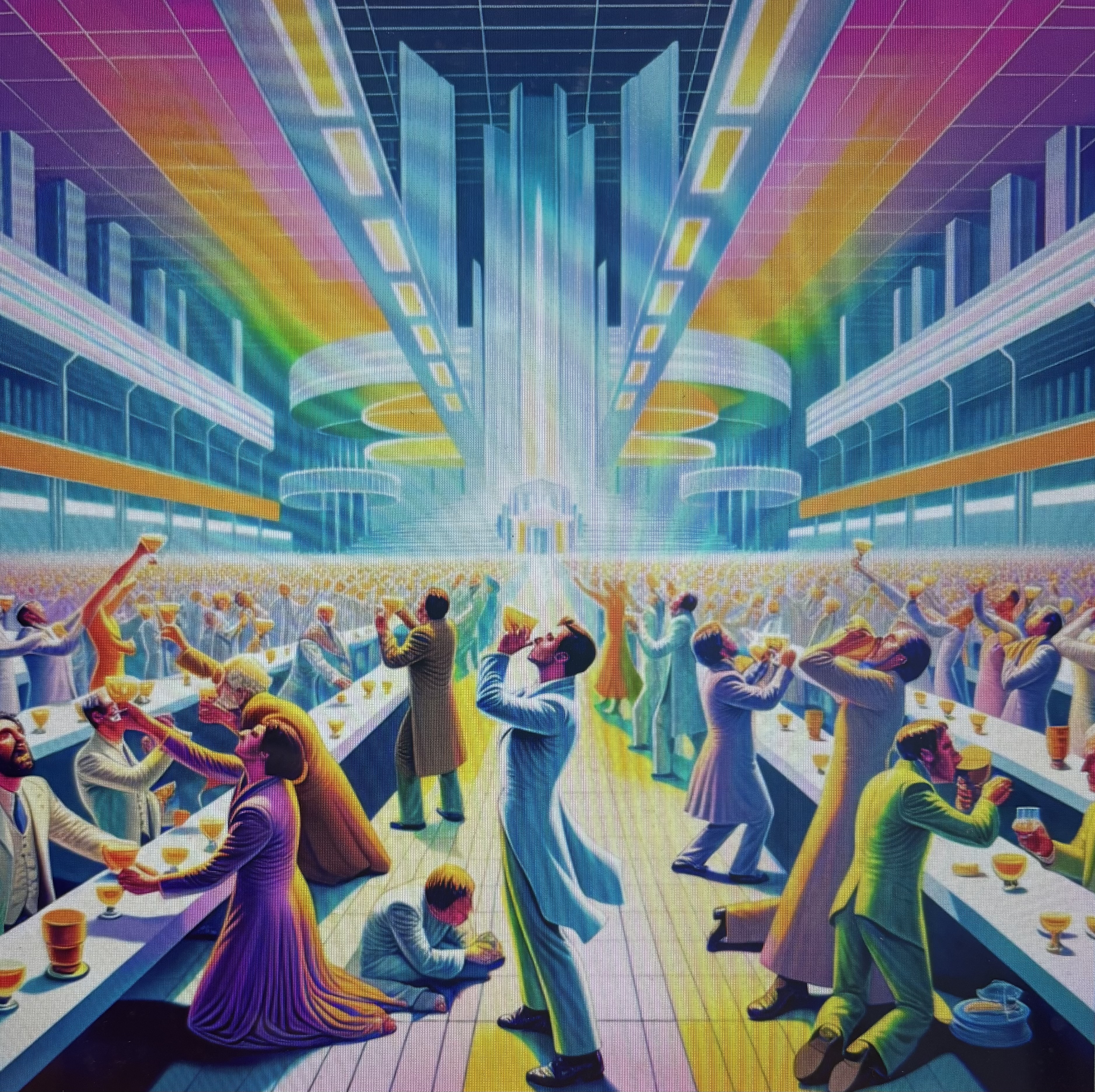 A grand communal worship praising Lord Ford takes place in the auditorium, with participants drinking soma and uniting through music and hymns. Bernard arrives on time but feels out of place and awkward among the others. The ritual grows more ecstatic as everyone believes in the presence of "the Great One" and dances in ecstasy. While others fall into euphoria due to soma, Bernard merely imitates without truly feeling anything. Even after the ceremony, he feels isolated, empty, and more alone than ever, unable to merge with the group. He hears and sees nothing others claim to experience and falls into self-contempt. The communal worship acts as a tool to erase individual identity through collective illusion and unity. Bernard tries to follow but ultimately fails to achieve true integration, sinking into despair.