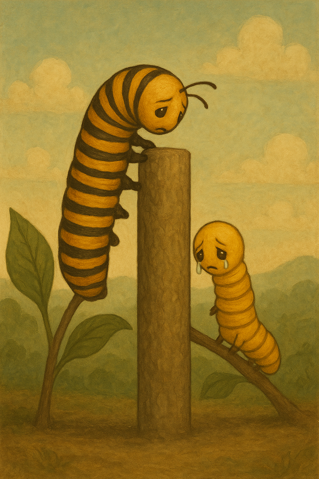 At first, the striped caterpillar believes success means climbing higher than others. He is surrounded by those who push, step, and hurt each other to reach the top. In that world, kindness and friendship are seen as weaknesses. He feels proud of his progress but begins to question the purpose of his struggle. “What’s at the top? What are we even chasing?” becomes a voice in his mind.
